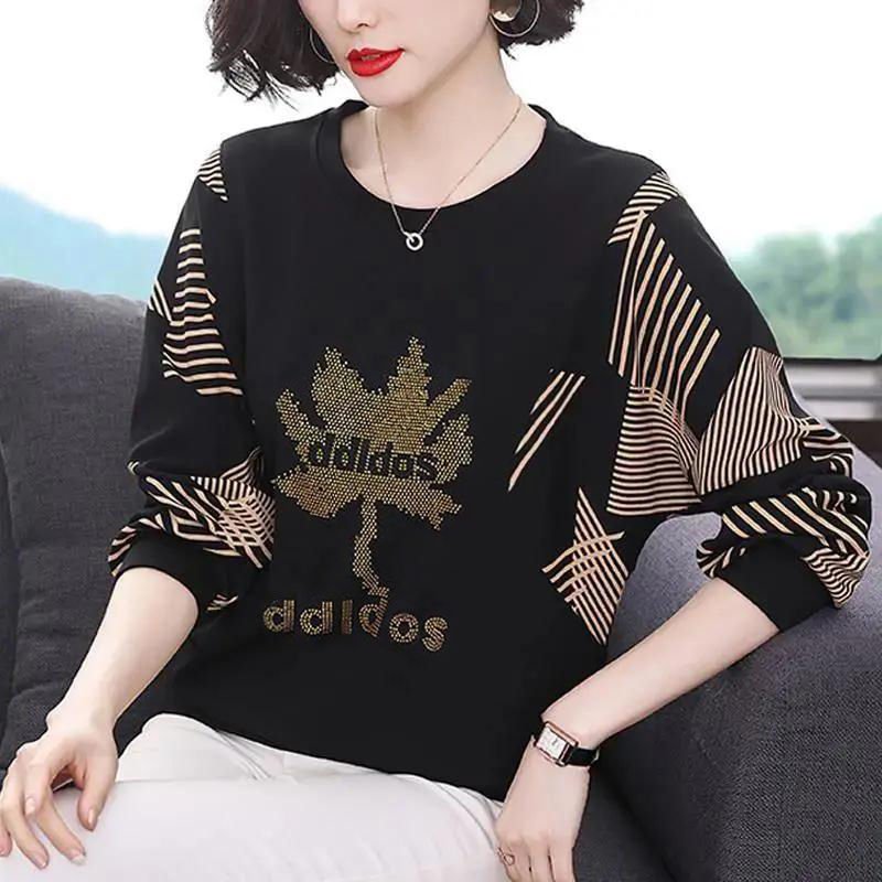 เสื้อยืดแขนยาวติดเพชรทรงหลวมผู้หญิง