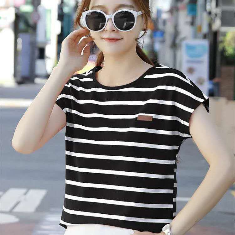 เสื้อยืดผ้าฝ้ายลายทางแมทช์ง่ายสไตล์เกาหลี